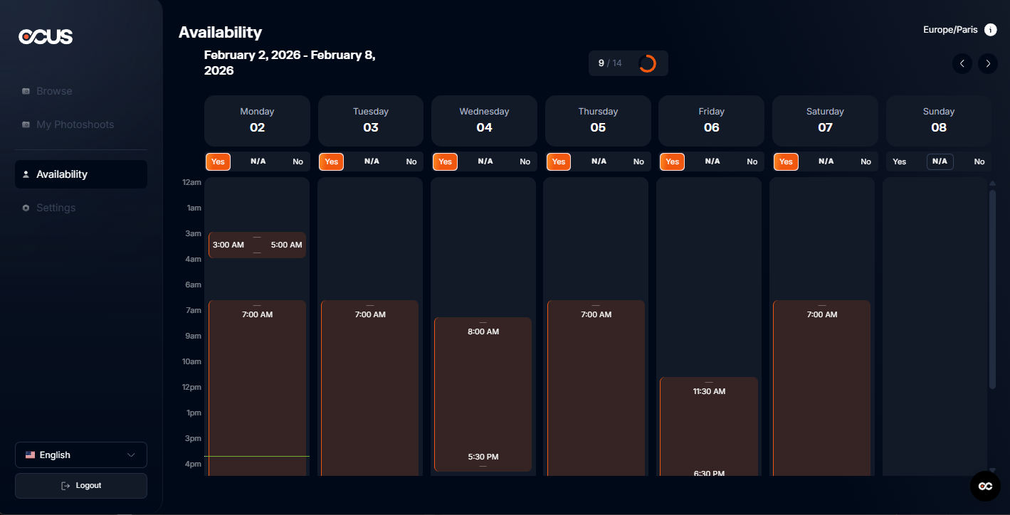 The OCUS calendar is designed for short-term planning and allows you to set your availability for the next 14 days.