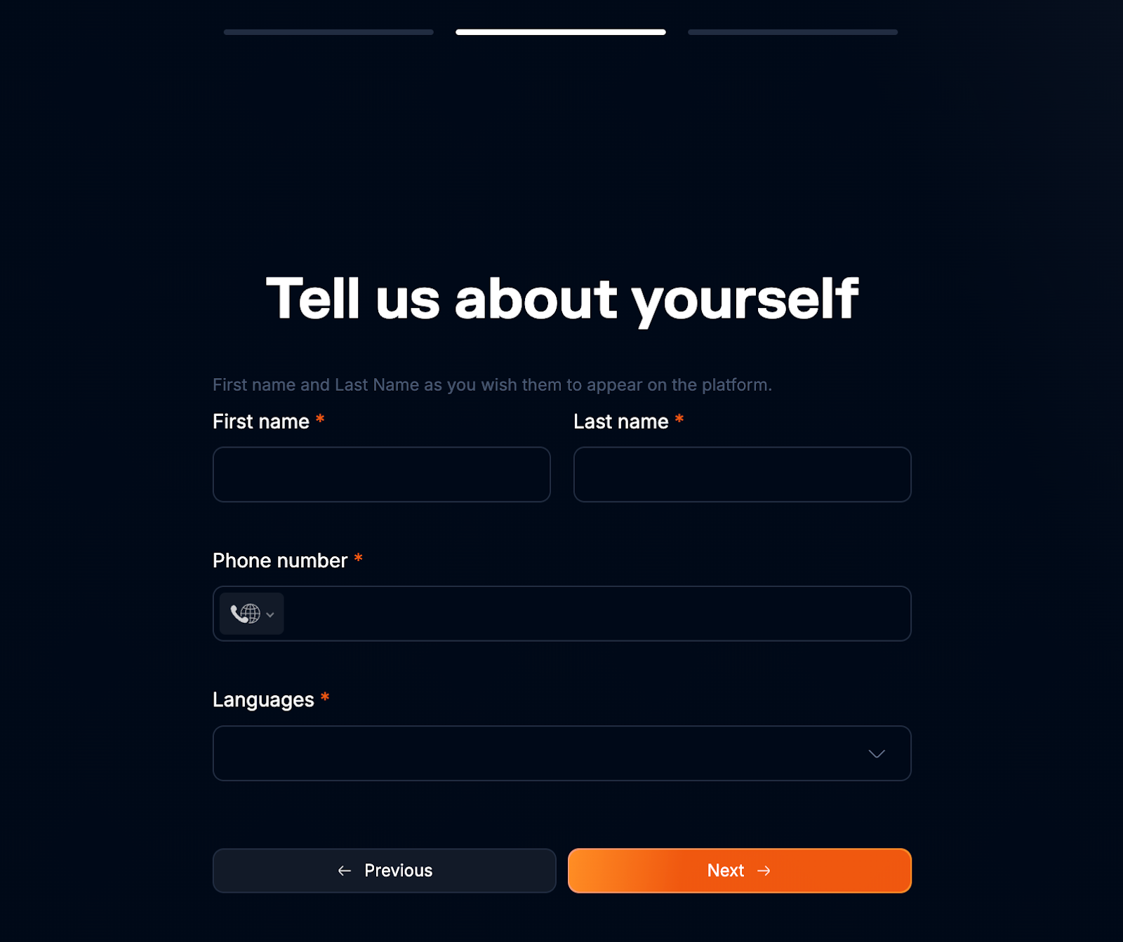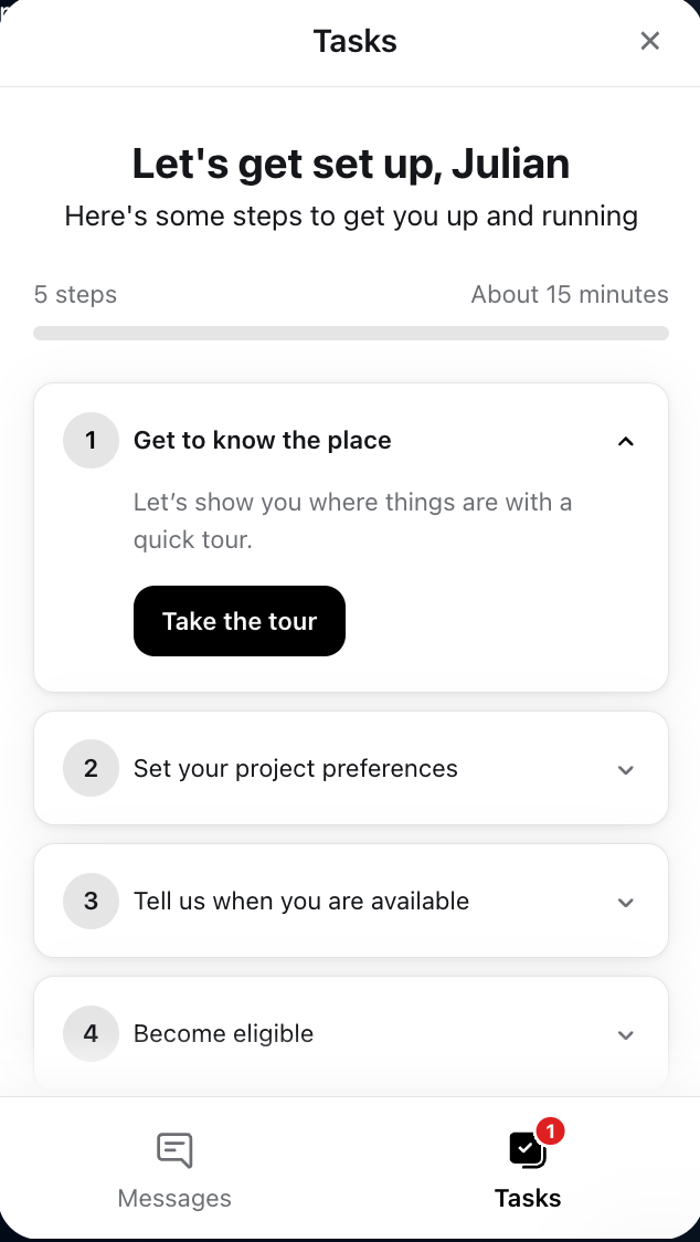7. Continue with the final five onboarding steps. These will help you understand the website, set your project preferences and availability, and submit your identification and portfolio. Once completed, you’ll be ready to start working with us.