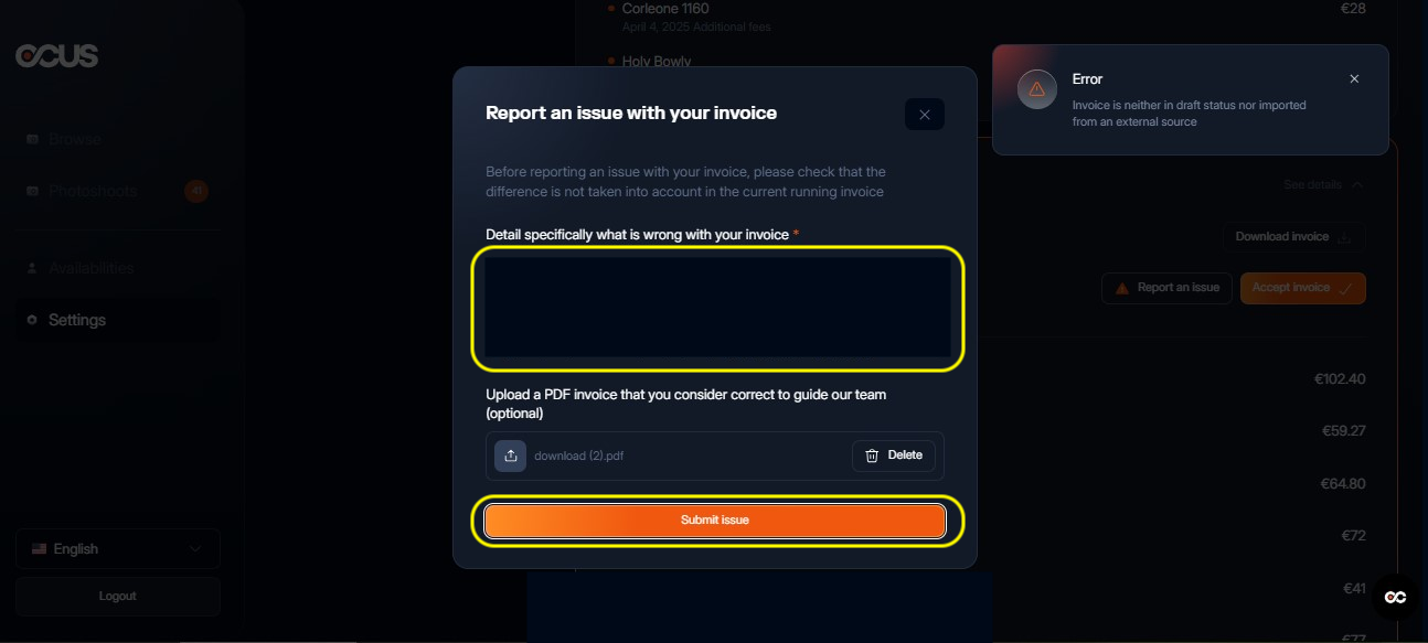- ⚠️ Signaler un problème → si quelque chose semble ne pas être correct, vous pouvez signaler un problème et notre équipe regardera cela dans les plus brefs délais. Veuillez ne pas ajouter de capture d'écran en tant que document.